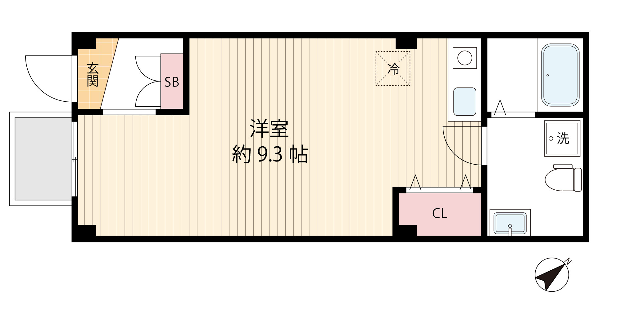 お部屋は広々とした9.3帖のワンルーム。